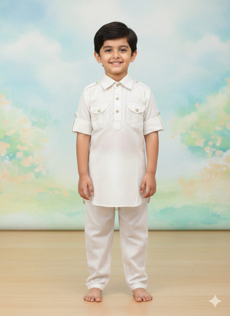 Make every celebration memorable with our exquisite 3-piece Kurta Set. Designed specifically for toddlers, this ensemble perfectly balances ethnic sophistication with all-day comfort. Whether it’s a wedding, a festive puja, or a family gathering, your handsome little man will be the center of attention.
