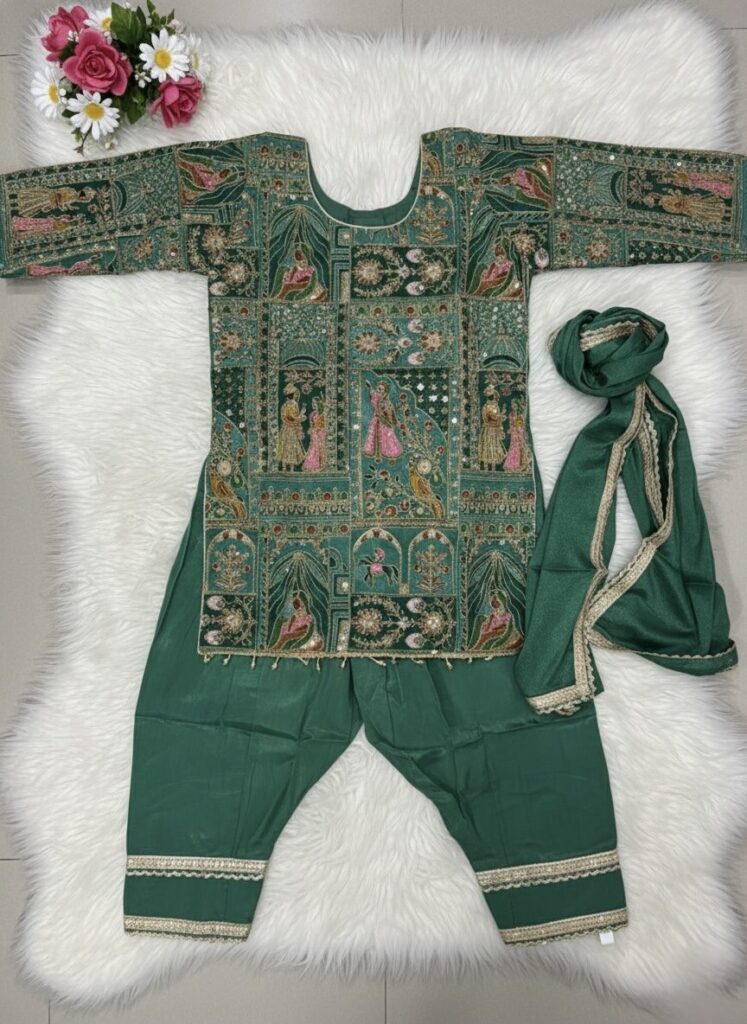 Elevate your little one’s festive wardrobe with this exquisite 3-piece ethnic ensemble. Crafted in a refreshing mint green hue, this set features intricate silver sequin embroidery and a modern pleated silhouette, perfect for weddings, Eid, Diwali, or any special celebration.