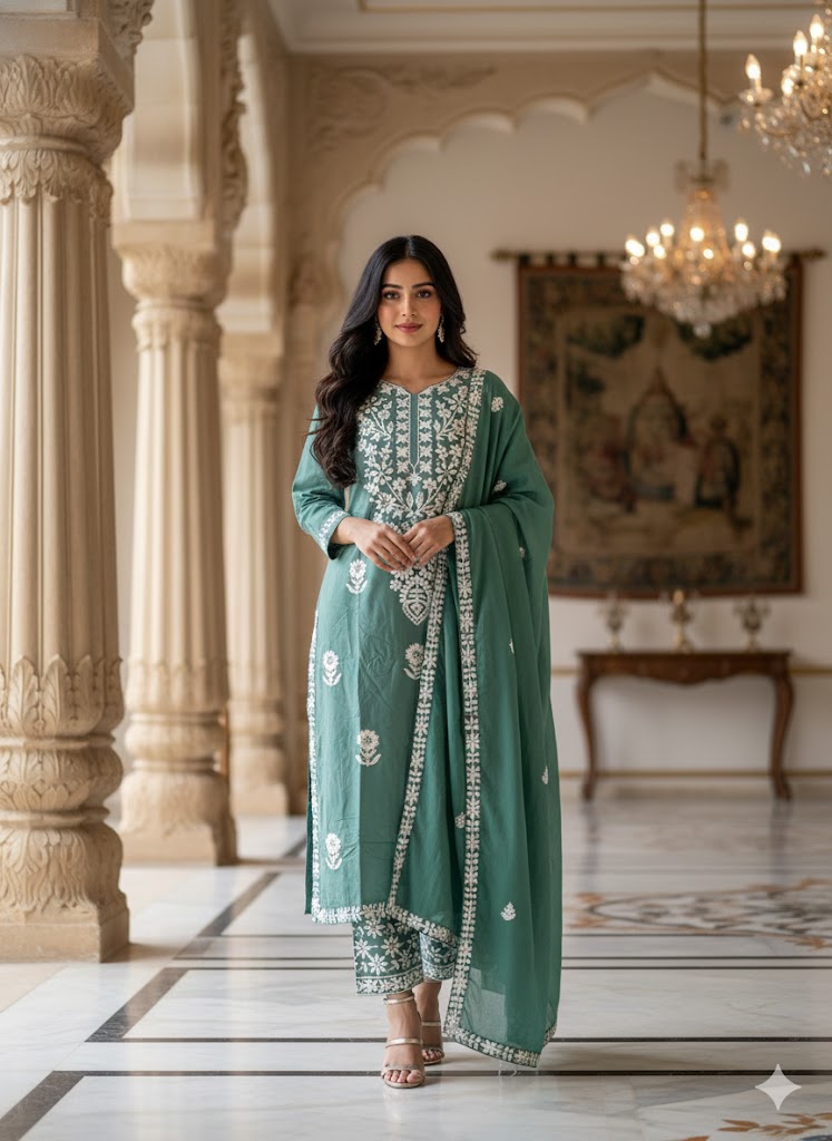 - Components: Three-piece ensemble including a long, straight-fit Kurta (tunic), matching Ankle-Length Trousers and Dupatta