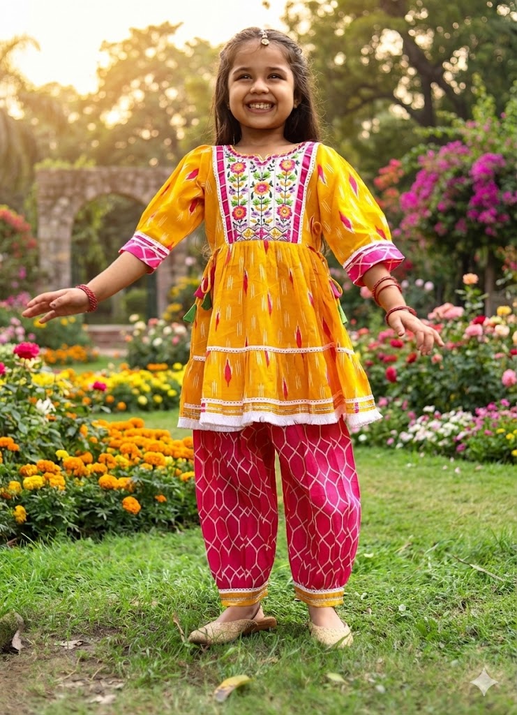 Perfect for festive days and playful afternoons, this adorable two-piece set blends traditional charm with modern comfort. The top features a sunny yellow base with a classic print, highlighted by a beautifully embroidered floral yoke and playful side tassels. It pairs perfectly with the contrasting hot pink geometric print salwar pants. Crafted from soft, breathable fabric, it ensures your little one stays comfortable while looking her best.